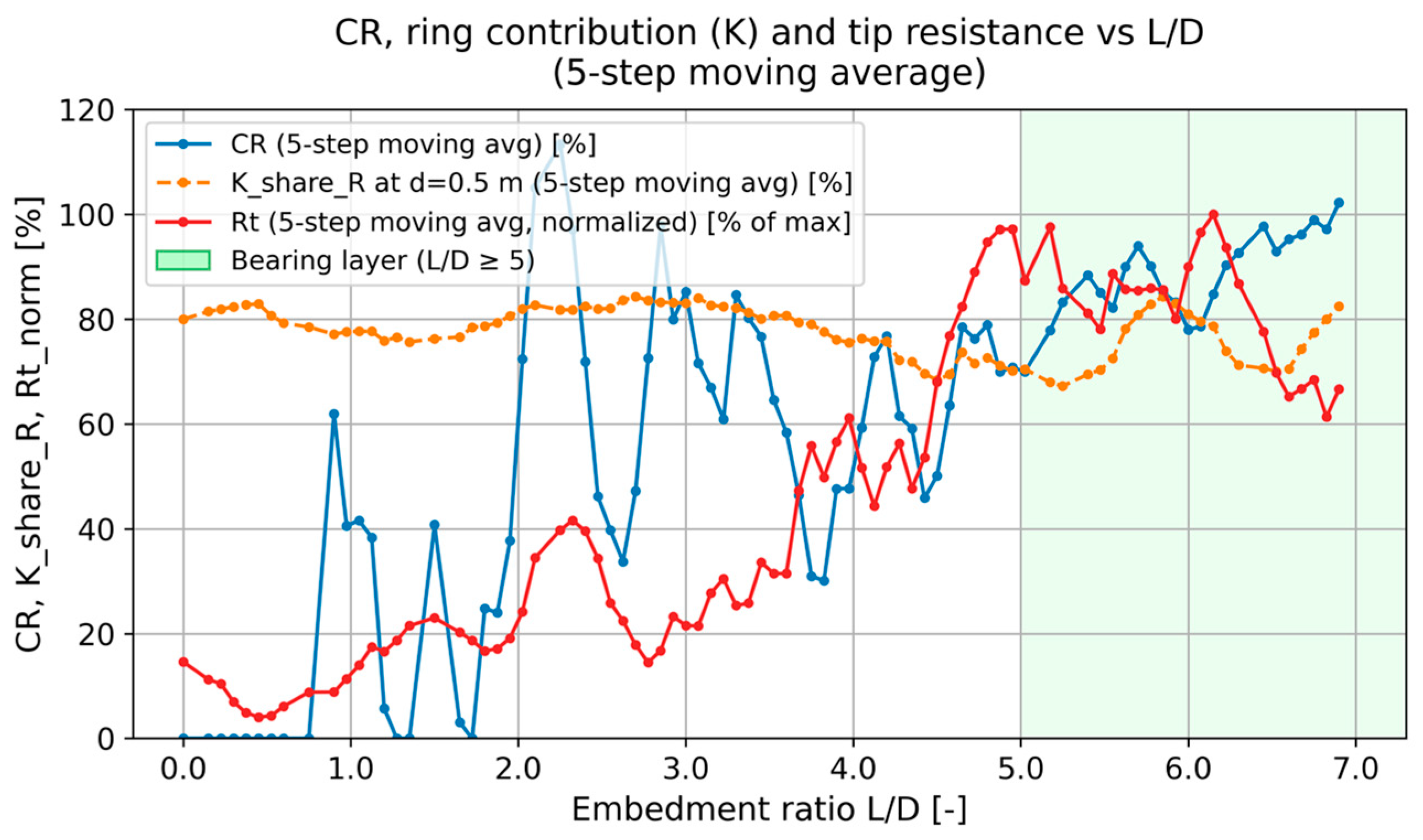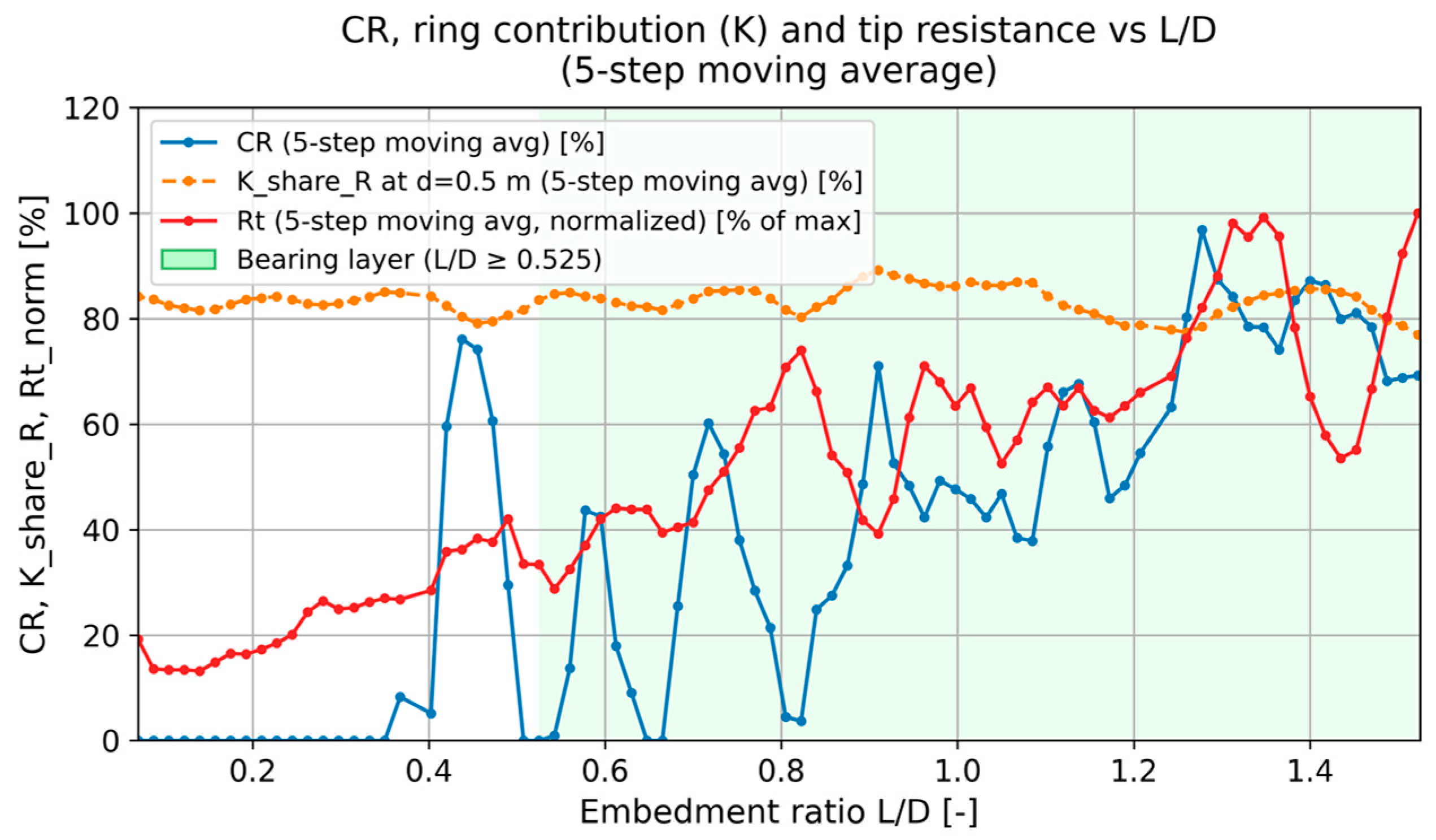 In contrast, the ring contribution (K-density share) remains high (80–90%) even at the same L/D, demonstrating that an increase in CR does not imply a transition to core-dominated resistance. Thus, plugging mainly enables the internal soil core to function as a confining element, while the primary bearing role remains with the ring.