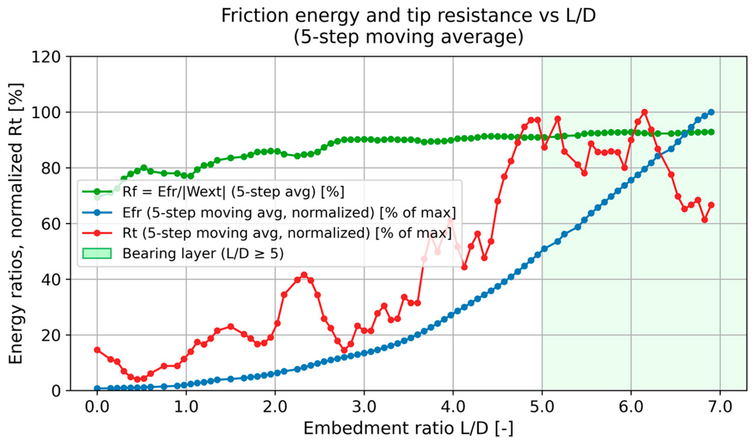 These observations indicate that tip resistance development in open-ended piles is governed by the following two distinct yet sequential energy mechanisms: plastic rearrangement during driving and elastic strut development during static loading, and this difference manifests as a significant contrast in R_f between the two phases.