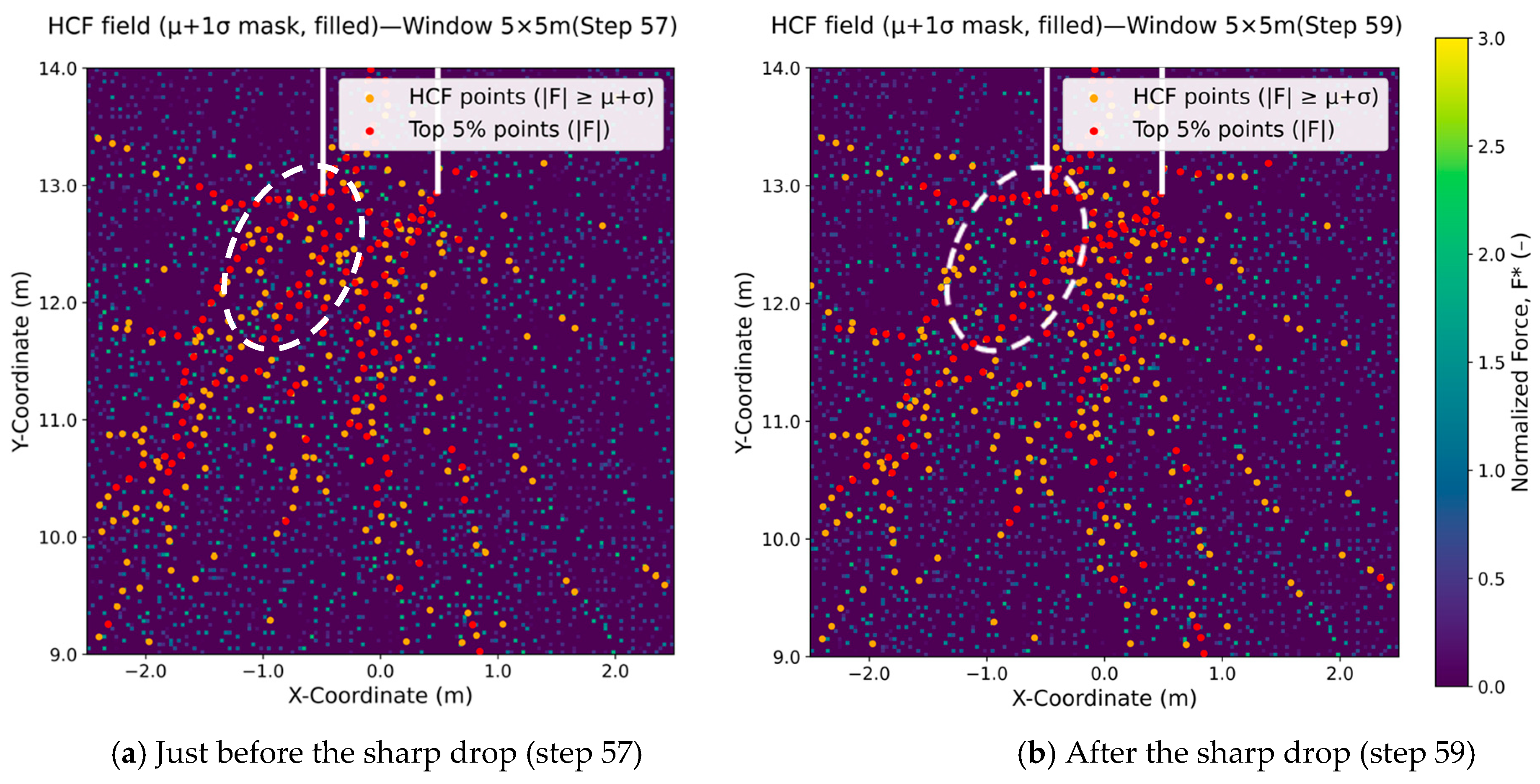 Normalization employed the mean μ from the Half 10 m × 10 m region, and HCF points were extracted using the threshold τ = μ + σ.