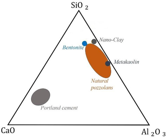 | Compound (%) | Raw Clay | Metakaolin | Bentonite | Nano-Clay |