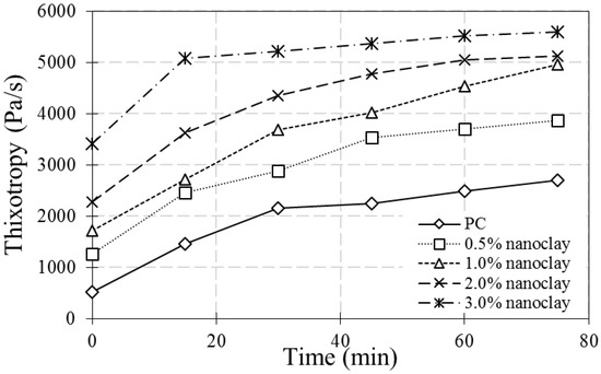 - The mixture with clay replacement has higher thixotropic and yield stress values, which results in the improvement of the shape stability. This characteristic is strongly suitable for using clay-based concrete in 3D printable concrete. This also results in lower shrinkage in the early-age life of the concrete. However, the high floc strength of clay-based concrete causes a reduction in flowability. Using a calcination method and nano-sized clay particles could not solve this issue. Hence, more experimental studies are necessary for future work to propose an efficient way of increasing the flowability of clay-based concrete mixtures. Moreover, there are significant research gaps for organo-clay in this field.