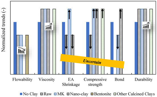 - Mineral clay has an inverse effect on hardened properties, while calcined clay improves the compressive strength of concrete. The calcination or burning process of clay minerals and using nano-clay make a crucial contribution to improving the concrete compressive strength. Regarding bentonite and organo-clay, conflicting results were reported for hardened properties which need to be investigated by future efforts. Moreover, considerable research gaps exist for bond strength (reinforcing bar and fibers).