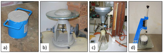 Apparatus used for fresh mixes characterizations (from the left to the right): (a) Standard slump cone used for density measurement; (b) Table flow used to determine consistency; (c) Büchner funnel for water retention determination; (d) Vicat cone for setting time evaluation.