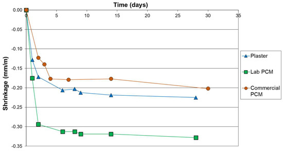 Figure 2 shows that the laboratory mix of PCM and gypsum (Lab PCM) exhibits a significantly more important shrinkage than the commercial one. Indeed, after the 28 days of curing, the material Lab PCM have shrunk of 0.33 mm/m, whereas the materials Plaster and Commercial PCM have shrunk of 0.23 and 0.20 mm/m. This more important shrinkage is certainly due to the fact that the material Lab PCM needed a higher amount of water (33 wt.%) in order to reach an acceptable consistency (see Table 1). Indeed, the shrinkages of the three materials were all related to the amount of water added. It is to notice that the samples were weighed and that the drying steps of the samples evolved in the same trends as the shrinkages. No maximal shrinkage criterion are defined for gypsum plaster, however, as a comparison, for clay plaster the maximal shrinkage is set at 20 mm/m [33] and for concrete it can goes from 0.1 to 0.8 mm/m [34]. Hence, all the samples of this study present shrinkage values that could be considered as acceptable.