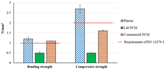 Results presented in Table 3 and in Figure 3 show that the addition of PCM causes major losses of the mechanical properties in the case of the experimental lab preparation. In this way, compare to the raw material Plaster, the material Lab PCM has a loss of dynamic modulus elasticity of about 90%, a loss of bending strength of 58% and a loss of compressive strength of 81%. Furthermore, Figure 3 shows that because of these lower performances, the material Lab PCM does not meet the mechanical resistance requirements of the EN 13279-1 [30]. This might be due to an insufficient cohesion of the gypsum’s grains and/or the presence of voids due to the initially larger amount of water. This is strengthened by the fact that the material Lab PCM shows a lower density than expected (see Table 2) and by the fact that the material Commercial PCM showed much better bending and compressive strengths.