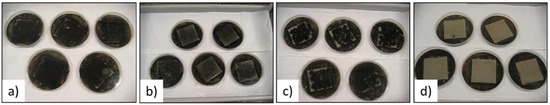 Visual observation of the samples at the end of the mold resistance test. (a) sample Plaster; (b) sample Lab PCM; (c) sample Commercial PCM; (d) sample of cement + lime.