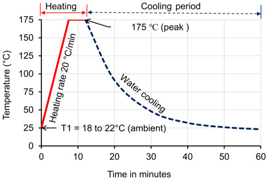 A total of 12 cube samples from each mortar type (geopolymer, epoxy and plain PC) at age of 3-day were exposed to hydrocarbon-based synthetic oil, fluid, and elevated thermal cycles, simultaneously. AeroShell Turbine Oil 500 (a synthetic hindered ester oil with some additives), AeroShell Fluid 31 (a synthetic hydrocarbon-based hydraulic fluid) and jet fuel (mostly kerosine) were secured from Skyfuel Australia Pty. Ltd. (The Oaks, NSW, Australia). An equal amount of these oils and fluid were sprayed on the surface of the cube specimens once daily except at weekends for 5 months. Moreover, the hydrocarbon-treated mortar cubes were exposed to the heating and cooling cycle, as shown in Figure 1. A convection oven was used for heating and the heat-treated samples were submerged in a water tub for cooling down to room temperatures. Water cooling was selected to simulate precipitation effects on the pavements at airbases. Heating and cooling cycles of the mortar samples were conducted 2–3 times a week. After every 20 cycles, 3 exposed mortar specimens from each mortar type were tested under compressive load to investigate the loss of the compressive strength.