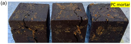 Geopolymer mortar also faced saponification during the same exposure but did not develop cracks, as shown in Figure 2b. Esters of fatty acid reacted with free in geopolymer at high temperatures and produced sodium carboxylate, which is also a salt, and the process is known as saponification [54]. This implies geopolymer is also susceptible to saponification like ordinary PC mortar when exposed to synthetic hydrocarbon-based oil at elevated temperatures. However, probably due to stronger microstructures or more heat resistance ability than PC mortar, geopolymer did not experience thermal crack.
