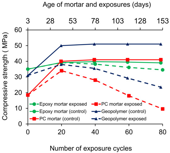 Figure 4 presents the mass loss behaviour of the PC, epoxy and geopolymer mortar when exposed to thermal cycles only. After 80 cycles of high thermal exposure, the PC, epoxy and geopolymer lost approximately 5%, 1% and 7% of the mass, respectively. Due to the high volume of initial water (free) in the PC mortar for hydration and geopolymer for the polymerization reactions, they lost a significantly higher amount of mass than that of the epoxy mortar. As reported, epoxy mortar starts losing its epoxy groups at 220 °C and the loss becomes substantial at 320 °C [56]. This implies the epoxy chain (crosslink) did not start losing moisture at 175 °C; however, geopolymer and PC gel showed a significant reduction in the mass during the high thermal exposures.
