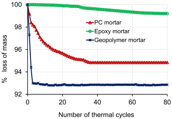 Mass loss of the PC, epoxy and geopolymer mortar when subjected to thermal cycles only.