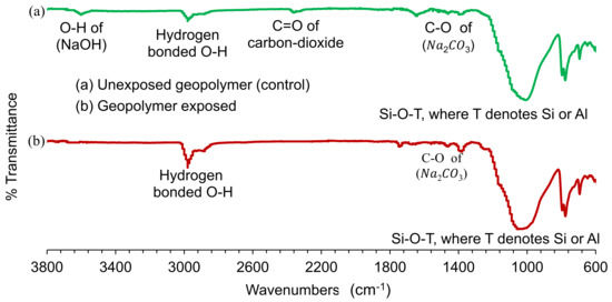 FTIR spectrums of the (a) unexposed geopolymer specimens (control) and (b) the geopolymer mortar exposed.