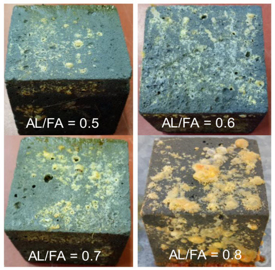 The appearance of geopolymer mortar cubes with various AL/FA ratios after 80 cycles of exposure to the simulated airfield condition.