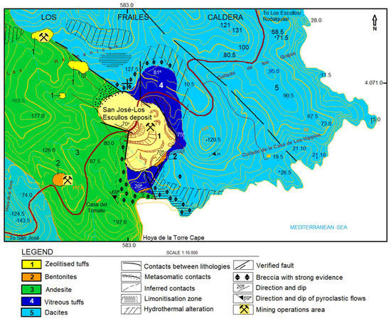Los Frailes Caldera has been investigated for several decades because it is considered an enclave of great interest, not only from a geological and geochemical point of view, but also because of the presence of volcanic materials, whose physical, chemical, and mineralogical characteristics provide it with properties that have attracted the attention of many researchers and technologists. Geological investigations have established that Los Frailes Caldera contains volcanic materials of medium basic chemism consisting of basaltic andesites and dacites of the Los Frailes Unit (FR-1), more acidic varieties such as dacites and rhyolites of the Rodalquilar Complex, and pyroxenic basaltic andesites of the Los Frailes Unit (FR-2) [,,,,] (Figure 1). According to Arribas [] Los Frailes Caldera is a circular volcanic structure which is approximately 5 km in diameter, which was formed 14.4 ± 0.8 ma ago because of eruptive processes of several pyroclastic flows of dacitic and andesitic composition. At the same time, Benito et al. [], Costafreda [], Costafreda and Martin [], Costafreda et al. [], Presa et al. [], and Stamatakis et al. [] have recently investigated and described minerals and industrial rocks inside Los Frailes Caldera, consisting of strongly zeolitized and bentonitized cineritic tuffs (ZBT) and glassy volcanic tuffs (GVT), to be used in the production of pozzolanic cements, mortars, concretes, and as light aggregates for concrete. Other researchers [,,] have focused their research on the bentonite deposits of the Los Frailes Caldera and surrounding distal areas. However, the studies carried out on the deposits of zeolite and bentonite inside the caldera have traditionally been developed on the surface, as the materials’ physical, chemical, and mineral properties were unknown at the deeper horizons.