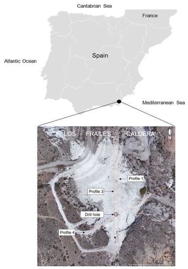This work has been structured as follows: a lithogeochemical sampling of drilling cores was carried out at different depth intervals; a series of samples were characterized by chemical and mineralogical tests; and finally, a geophysical research campaign was carried out on the site to delimit the contours of the area investigated in depth (Figure 2).