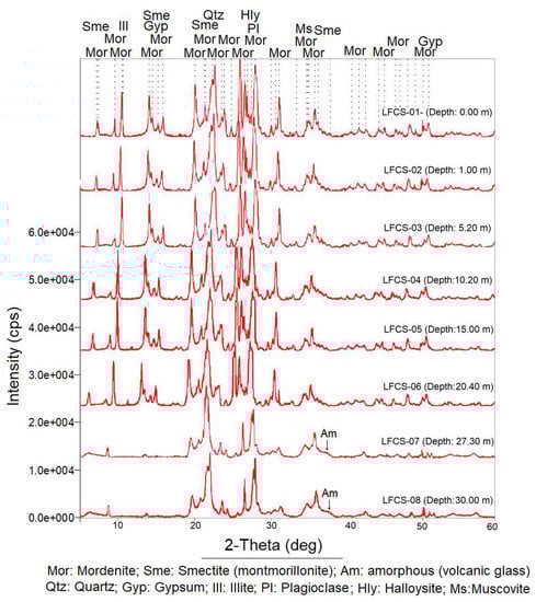 According to the X-ray diffraction patterns obtained by each sample from different depths, an uninterrupted proliferation of the mordenite phase is observed at all levels, which is evidenced in the discussion stated in Section 2.2. An increase in the amorphous phase is highlighted in all X-ray diffraction patterns, mainly in those representing the LFCS-07 and LFCS-08 samples; the latter could be interpreted as a remnant feature of the Neogene volcanic period in the southeast of the Iberian Peninsula, in which frequent horizons of pyroclastic material in the form of glass and cinerite could have been formed; this deduction is made due to the conclusions reached by previous researchers, including Seligman et al. [] and Angelopoulos et al. []. Despite the mineralogical complexity of the samples investigated, it is established that this fact contributes to the manifestation of their pozzolanic properties [].