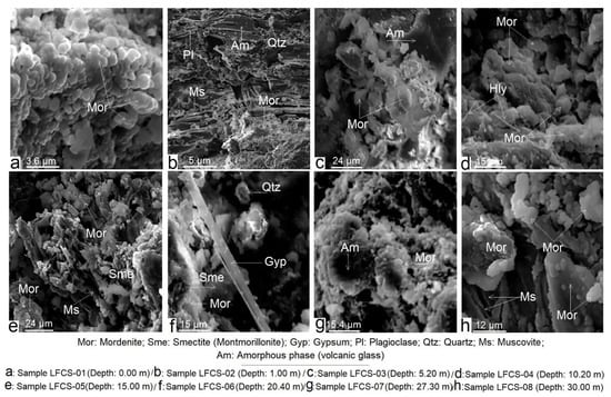 Figure 4a–h shows eight microphotographs corresponding to the samples investigated (LFCS-01 to 08), obtained by SEM. According to these results, the predominant mineral phase is the mordenite variety zeolite, which is present throughout the stratigraphic column of the study area, from the surface to 30 m, which represents the lower limit of study. In addition to mordenite, the smectite (montmorillonite), muscovite, plagioclase, halloysite, gypsum, quartz, and devitrified volcanic glass representing the amorphous phase was detected. According to the information offered in Figure 4b,c,g, it follows that zeolitic mineralization occurred from the hydrothermal alteration of the amorphous phase; this reasoning is also reflected in the work of Presa et al. [].