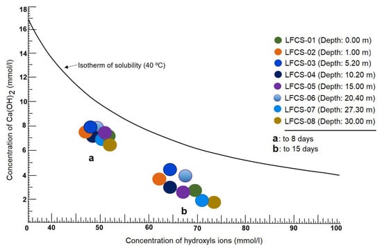 According to Figure 5a,b, all samples investigated, both at 8 and 15 days, show a remarkable pozzolanic reactivity. At eight days (Figure 5a), in the area under the isothermal solubility curve at 40 °C, there is an evident tendency to the concentration of all samples, showing a similar behaviour, although the LFCS-08 sample can be clearly highlighted as the most pozzolanic.