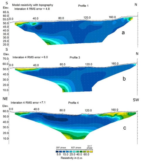 Tomographic profiles of resistivity according to the data obtained by the geophysical method of ERT. Profiles (a) (north-south direction), (b) (north-south direction) and (c) (north-east/south-west) show the behaviour of ERT values on lithological horizons at different depths.