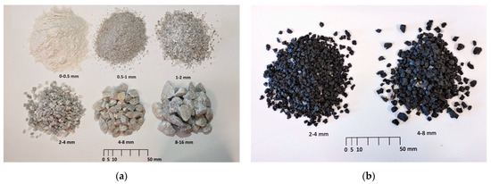 Type II Portland cement with a characteristic strength of 42.5 MPa and crushed limestone aggregate (hereafter referred to as mineral aggregate) with a nominal maximum size of 16 mm was used for all the concrete mixtures. The aggregates were sieved in six gradations for the purposes of this study (Figure 1a). Rubber particles obtained from the tyre-recycling plant Retire ABEE in Drama Greece were used. Their size varied from 2–8 mm and they were sieved in two gradations, 2–4 mm and 4–8 mm, to match the mineral aggregate ones (Figure 1b). The bulk density of the rubber particles was approximately 1/3 of that of the mineral aggregates, as measured in the lab. A superplasticiser was also used in all mixtures to improve the workability of fresh concrete.