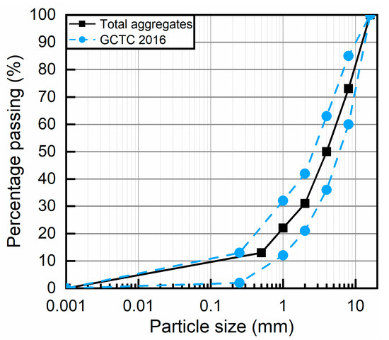 Particle size distribution of the total aggregate and GCTC 2016 boundaries.
