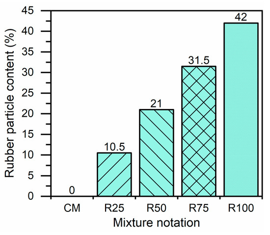 A plain concrete mixture (CM) was designed according to the grade distribution limits set in the Greek Concrete Technology Code 2016 [38], as presented in Figure 2. When designing the mixtures, the possibility of water absorption from the dry mineral aggregate was also considered, and more water was added in the final mixture. Hence, the water to cement ratio (w/c) was equal to 0.397 for all mixtures. The proportions of each concrete mixture are presented in Table 1. In rubberised concrete mixtures, two of the fine aggregate particle sizes (2–4 mm and 4–8 mm) were replaced by a volume with rubber particles of the same size with replacement ratios of 25% (mixture R25), 50% (mixture R50), 75% (mixture R75) and 100% (mixture R100). Therefore, the rubber particles comprised 10.5%, 21%, 31.5% and 42% of the total aggregate volume in mixtures R25, R50, R75 and R100, respectively (Figure 3).