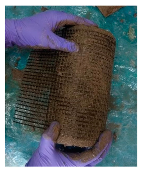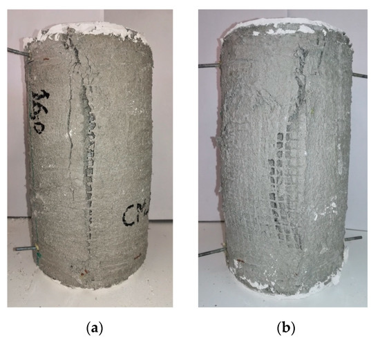 TRM confinement was applied in 6 specimens from each mixture; 3 specimens were confined with 1 TRM layer and 3 with 2 TRM layers, totalling in 30 confined specimens from all five mixtures. A two-directional coated basalt-fibre textile with a 6 mm square mesh was used for the TRM jackets. The particular mesh size was considered more suitable for the size of the cylindrical specimens used in this study. The properties of the basalt textile according to the manufacturer’s datasheets are presented in Table 2. A commercially available cementitious mortar was used as matrix, comprising a water to binder ratio of 0.23. The dry binder contained fine aggregates with a maximum size of 1.3 mm and microfibres made of polypropylene. The strength of the mortar was found through flexural and compressive tests on three 40 mm × 40 mm × 160 mm mortar prisms according to EN 1015-11:2019 [43]. The average values of the compressive and flexural strength were 22.59 MPa and 4.02 MPa, respectively.