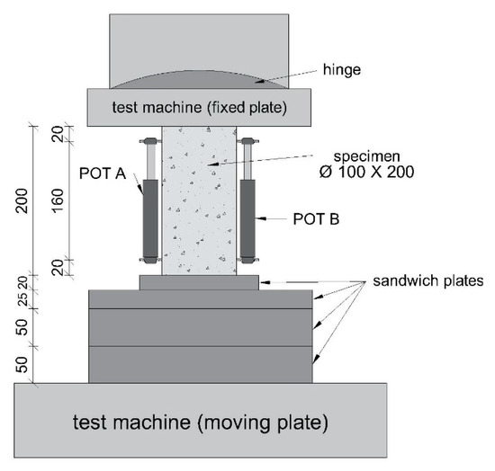 Before testing, all specimens were capped with gypsum to ensure the levelness of the testing surface. Potentiometers were used to record axial deformations in the majority of specimens. Two potentiometers (POT A and POT B) were attached parallel to the specimen’s longitudinal axis and placed diametrically opposed, as presented in Figure 5. The compression tests were carried out using a 3000 kN capacity testing machine with a constant displacement rate of 15 μm/s. Data were recorded using a fully automated data acquisition system.