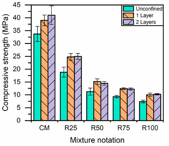 Confinement with 1 TRM layer increased the compressive strength by 15.8% for CM and to 35.5% for R100. In the case of two TRM layers, the increase was 21.7% for CM and 38.1% for R100 (Figure 6). The statistical analysis indicated that confinement also significantly affected strength (F(4, 53) = 154.45, p < 0.001, partial η2 = 0.69). More specifically, specimens confined by one or two layers exhibited a higher strength compared to the unconfined specimens (0L: 16.1 ± 0.26 vs. 1L: 20.28 ± 0.42 and 0L: 16.1 ± 0.26 vs. 2L: 20.58 ± 0.44; p < 0.001). Similar to what has been reported for FRP confinement [25,28], the effectiveness of the TRM confinement was enhanced for a higher rubber content, as the increased lateral dilation caused by the rubber particles led to the earlier activation of the TRM jackets. The de-creasing trend of the compressive strength was comparable to that of the unconfined specimens as the rubber content increased.