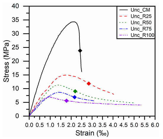 Stress–strain curves of the unconfined specimens. Markers denote failure (20% stress drop).