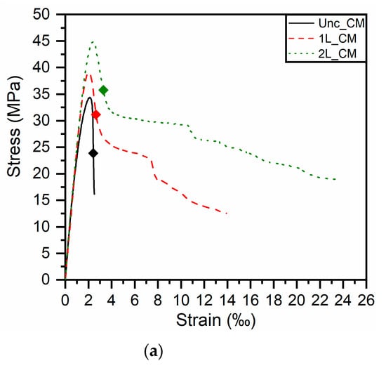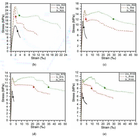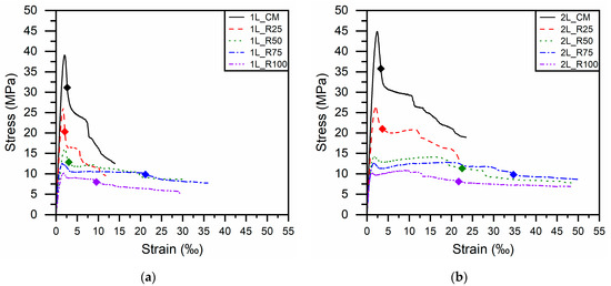 Stress–strain curves of (a) 1 TRM layer- and (b) 2 TRM layer-confined specimens. Markers denote failure (20% stress drop).