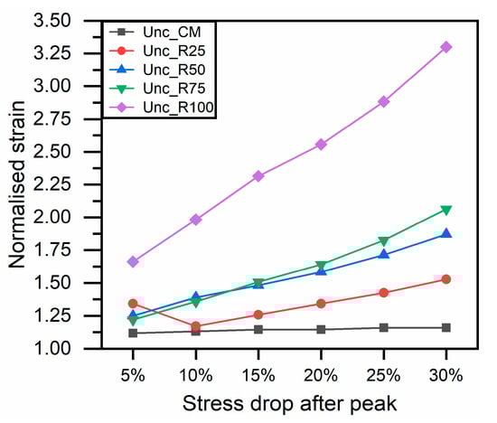 Normalised strain values at different stress drop levels for the unconfined specimens.