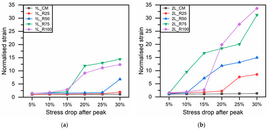 Normalised strain values at different stress drop levels for confined specimens with (a) 1 TRM layer and (b) 2 TRM layers.