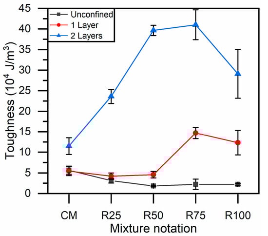 The toughness of each mixture was calculated as the area under the stress–strain curve until failure (denoted by drop of stress by 20%). For the unconfined specimens, xplain concrete mixture (CM) exhibited the highest toughness, and the rest of rubberised concrete mixtures had similar lower values (Figure 12). This indicates that, despite their higher axial strain capacity post-peak compared to plain concrete, the significant loss of strength prevented rubberised concrete from achieving a high energy absorption capacity.