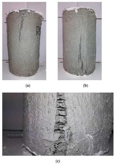 All unconfined CM specimens exhibited a similar brittle failure as a result of extensive longitudinal cracking; a typical failure mode is presented in Figure 13a. The use of rubber particles altered the failure mode to a more gradual one as the rubber content increased. The incorporation of rubber particles led to an increased number of finer cracks in the specimens, as presented in a typical specimen from mixture R100 in Figure 13b. In high rubber contents, extensive cracking appeared at the top or bottom surfaces of the cylindrical specimens. Additionally, specimens with increased rubber content exhibited larger lateral dilation due to rubber’s high elasticity.