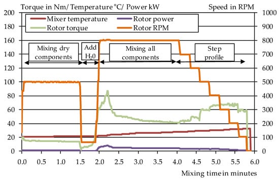As no standard fresh concrete procedure could be carried out due to the extremely high stiffness, the first step was to use the mixer data for the rheological classification of the mixes. Analogous to the studies from [5], an Eirich R05T intensive mixer with a maximum capacity of 40 L was used to produce the mortars for the extrusion process. With the mixer, the drum as well as the mixing paddle can be controlled separately. Furthermore, the motor data, the temperature in the mixer and the resistance torque can be recorded during mixing. For each batch, 18 L of fresh mortar were produced. First, the dry components were homogenised at 500 revolutions per minute for a duration of a minute. Then, the water was added within 15 s at 66 revolutions per minute. The mortar was then mixed for a further 130 s at 800 rpm. Finally, the revolutions per minute were reduced at intervals of 100 revolutions per minute every 15 s to investigate the rheological behaviour of the compounds at different loads. During the mixing process, the mixing data were also recorded. The diagram in Figure 1 shows the exemplary mixing data for mixture 1.