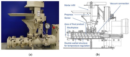 A Händle laboratory extruder was used for the extrusion of the textile-reinforced mortar. The extrusion process of the laboratory mortar textile extruder (LabMorTex) has already been presented in detail in [5,6]. Therefore, the procedure is only briefly summarised here. This consists of a pre-press and an auger. Various mouthpieces in different geometries can be attached to the end of the auger. The diameter of the main auger is around 70 mm. In the transition area between the pre-press and the main auger, it is also possible to generate a vacuum which de-airs and compresses the extrudate. Along the auger, it is possible to regulate the temperature of the mortar through the double-walled housing. Figure 2a shows a photo of the extruder and Figure 2b shows a technical drawing. After the mortar has left the mouthpiece, it is transported on a conveyor belt.