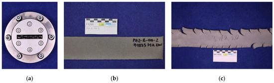 (a) Mouthpiece for the extrusion of textile mortar, cross section 60 × 10 mm, (b) example of a suitable mixture for the extrusion process, (c) example of an unsuitable mixture for the extrusion process.