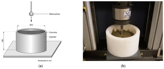 The cylinder was then placed in the universal testing machine 5566 from ZwickRoell GmbH & Co. KG (Ulm, Germany). The actual penetration test was carried out with three stainless steel spheres, which only differed in diameter (10 mm, 15 mm and 20 mm). The steel spheres are mounted on a punch which has a smaller diameter than the actual spheres, so that the mortar is only pressed in by the steel sphere and so the coat friction of the punch during penetration could be excluded. A schematic sketch of the test set-up is shown in Figure 4a and a photo during the test in Figure 4b. The spheres were inserted into the fresh mortar at a test speed of 1 mm/s to a depth of 30 mm.