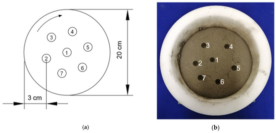 Arrangement of the penetration points 1–7 (a) and example of a fresh mortar sample tested with the 15 mm diameter sphere (b).