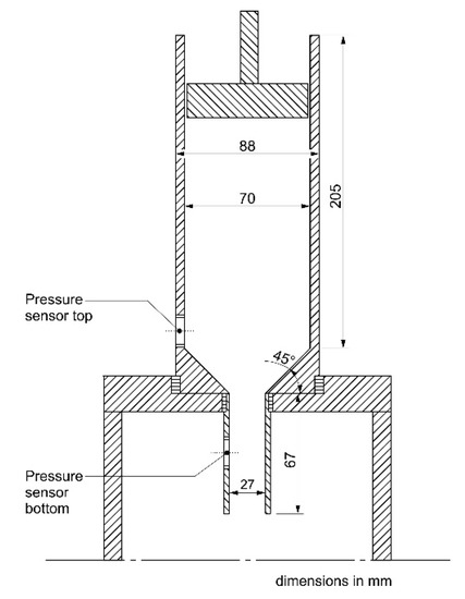 The upper cylinder has an inner diameter of 70 mm and a height of 205 mm. The inner diameter of the upper cylinder was chosen based on the geometry of the extruder’s main screw. The lower cylinder has an inner diameter of 27.6 mm and a height of 67.0 mm. The resulting cylinder opening has a cross-sectional area of around 600 mm2 and thus corresponds to the cuboid with 10 mm × 60 mm, which is also used to assess the extrudability. The aim of this experimental set-up is to simulate the flow behaviour of the fresh mortar realistically during extrusion with little effort. The two cylinders are screwed together with the conical connecting element so that the cross section decreases from top to bottom. In the connecting piece of the two cylinders there is a truncated cone through which the cross section is tapered at a 45-degree angle in diameters from 7.0 to 27.6 mm.
