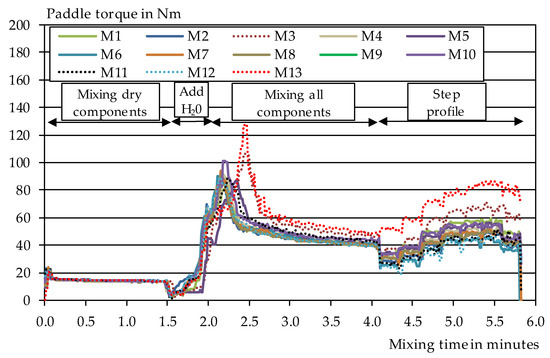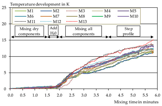 Figure 7 shows the relative temperature changes in all the tested mixtures from the beginning of the mixing process. During dry mixing, only a slight increase in temperature of approx. 1 Kelvin can be seen. As expected, there is only a significant increase in the measured temperature in the mixer after the addition of water.