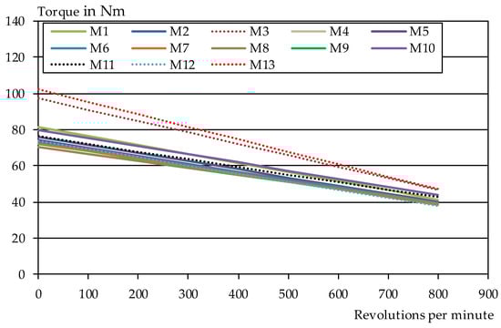 Figure 8 shows the measured torque during the mixing process for all of the mixtures. During dry mixing, the measured torque is approximately the same for all of the mixtures. The decrease with the beginning of the addition of water is related to the reduction in the speed. Immediately after the addition of water, the torque also increases here. Mixture 3 and mixture 13 show the highest measured torque, which can be attributed to a stiff fresh mortar consistency. At the beginning of the wet mix, the high torque can also be explained by the acceleration of the mixing paddle. With good mixing, the resistance decreases again. However, as before, there is no clear distinction between the extrudable and the non-extrudable mixtures, which means that the measured torque cannot be used as a clear characteristic value for assessing the extrudability.