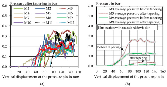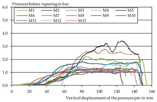 The results of the measured pressures immediately before tapering are shown in Figure 10. Again, the stiff, non-extrudable compounds M3 and M11 showed the highest measured pressures during the test. Occasionally, abrupt drops in pressure were recorded during the test. Here it can be assumed that the compaction of the fresh mortar by the ram before the actual test was not sufficient to remove all the large air pockets from the fresh mortar. This led to the mortar only being compacted in the capillary rheometer.