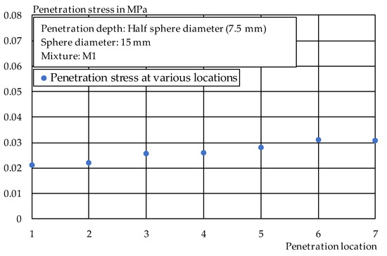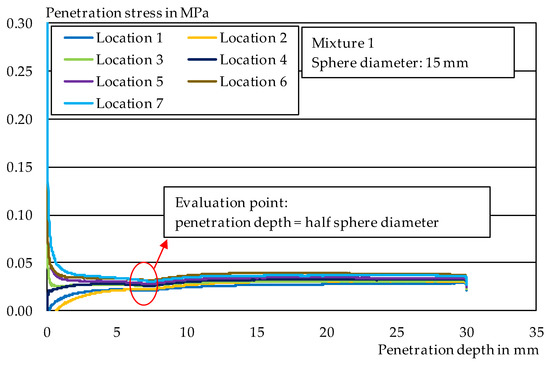 By dividing the recorded forces by the contact area, the resistance stress in MPa was determined, which describes the penetration resistance of the sphere during the test as a function of the respective penetration depth. A characteristic point can be seen for all compounds as soon as the penetration depth corresponds to half the sphere diameter. An example of this is shown in Figure 12. Since this point could be clearly identified for all of the mixtures, it was used for the evaluation of the penetration tests. In addition, this ensures that the mortar collapses above the sphere and thus influences the measurement of the penetration resistance.