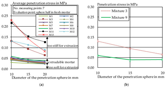 This can be explained by an increasing hydration and the dehydration of the fresh mortar on the mortar surface. To obtain a representative statement on the penetration behaviour of the spheres, the individual penetration stresses were averaged for each measurement. Figure 14a shows the results of the indentation tests as a function of the selected sphere diameter. Regardless of the selected diameter, all compounds which are apparently too stiff and therefore cannot be extruded can now be distinguished from the compounds that can be extruded. Compared to the other measuring methods, the penetration test enables a clear characterisation of the fresh mortar, with which it can be classified as too stiff for extrusion or extrudable.
