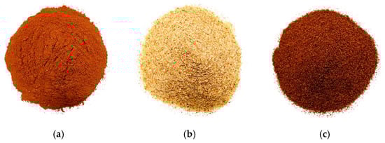 Photographs of raw materials: (a) red clay; (b) sawdust; (c) coconut coir dust.