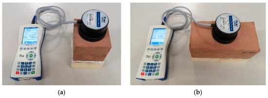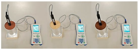The thermal properties (thermal conductivity and volumetric heat capacity) of each mixture were measured using a portable apparatus, ISOMET 2114 model, that directly measures the value via a surface probe attached to a temperature sensor (Figure 5). The experiment was conducted in a laboratory room environment with a temperature of 25 ± 1 °C and a relative humidity of 32 ± 2%. Prior to the test, each sample was cleaned with a cloth to remove dust or any interferents. During the experiment, the samples were positioned on a polyurethane block of 50 mm thickness to avoid any potential interference from the adjacent apparatus. For each mix design, two measurements were taken, and the mean was calculated. Knowing the volumetric heat capacity and density of the sample, specific heat capacity was calculated by dividing the volumetric heat capacity by the density value. Furthermore, thermal diffusivity and thermal effusivity were determined by the following Equations (2) and (3) [54]: