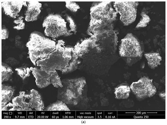 The materials used to produce the samples were red clay, coconut coir dust, sawdust, and tap water. Square mesh sieves were used to sieve the raw materials to obtain particle sizes between 2 mm–1.18 mm, 1.18 mm–300 μm, and 600 μm–425 μm for red clay, coconut coir dust, and sawdust, respectively (Figure 1). The maximum dry density (2320 kg/m3) and optimum moisture content (15.50%) of the clay were determined by the standard Proctor compaction test [51], while the Atterberg limit (liquid limit: 31.61%, plastic limit: 19.25, plasticity index: 12.36%) was established following the BS 1377-2:1990 standard [52]. Scanning electron microscopy (SEM) with a conductive coating was used to study the morphology of the raw materials. Moreover, X-ray fluorescence (XRF) and X-ray diffraction (XRD) analysis were used, respectively, for the evaluation of chemical composition and mineralogical phases of raw materials. Furthermore, the thermal characteristics of the raw materials were determined by ISOMET 2114 equipment using a needle probe (Figure 2). The thermophysical properties and chemical compositions of the raw materials are given in Table 1 and Table 2, respectively. SEM micrographs revealed that sawdust particles vary in size and form, with heterogeneous fibres and rough surfaces (Figure 3b). On the other hand, the spongy structure of coconut coir dust particles contains numerous pores (Figure 3c). The XRD analysis showed that red clay mainly contains quartz (SiO2), kaolinite (Al2(Si2O5)(OH)4), and haematite (Fe2O3) (Figure 4a), which was also supported by the XRF results presented in Table 2. Coconut coir dust and sawdust were amorphous in form, as observed by the disordered XRD patterns (Figure 4b).