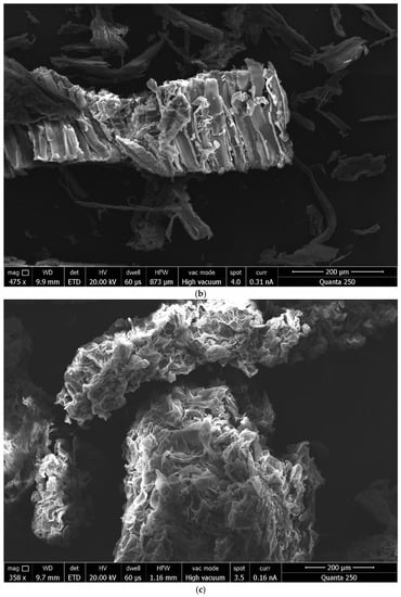SEM micrographs of raw materials: (a) red clay; (b) sawdust; (c) coconut coir dust.