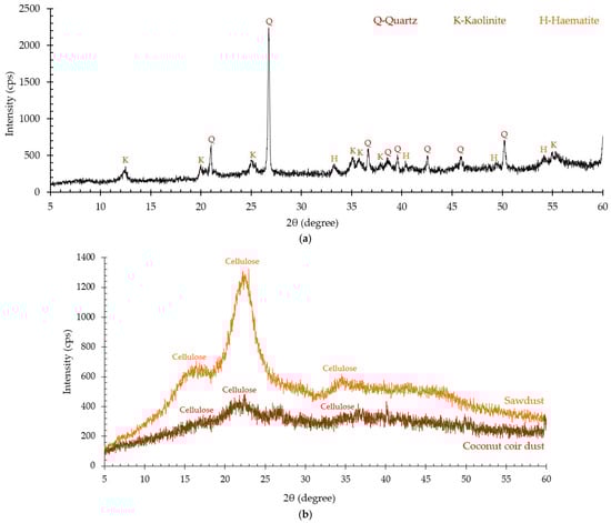 XRD spectra of raw materials: (a) red clay; (b) sawdust and coconut coir dust.